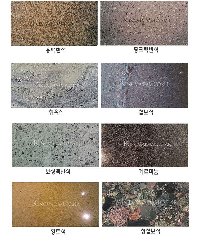 자연상태의 무늬가 아름답고 빛깔이 영롱하며 석재의 강도 또한 높습니다.