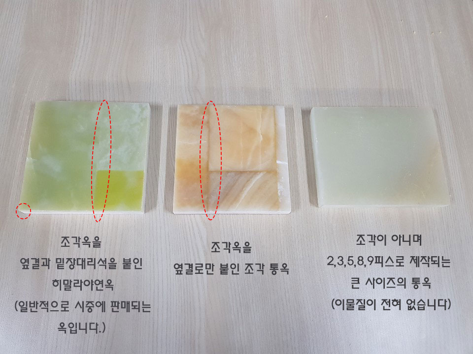 일반적으로 연옥 옥이라고 하면 한장 모두가 옥이 아닌 총 2센치의 두께중에 1.5센치는 천연대리석, 0.5센치는 옥으로