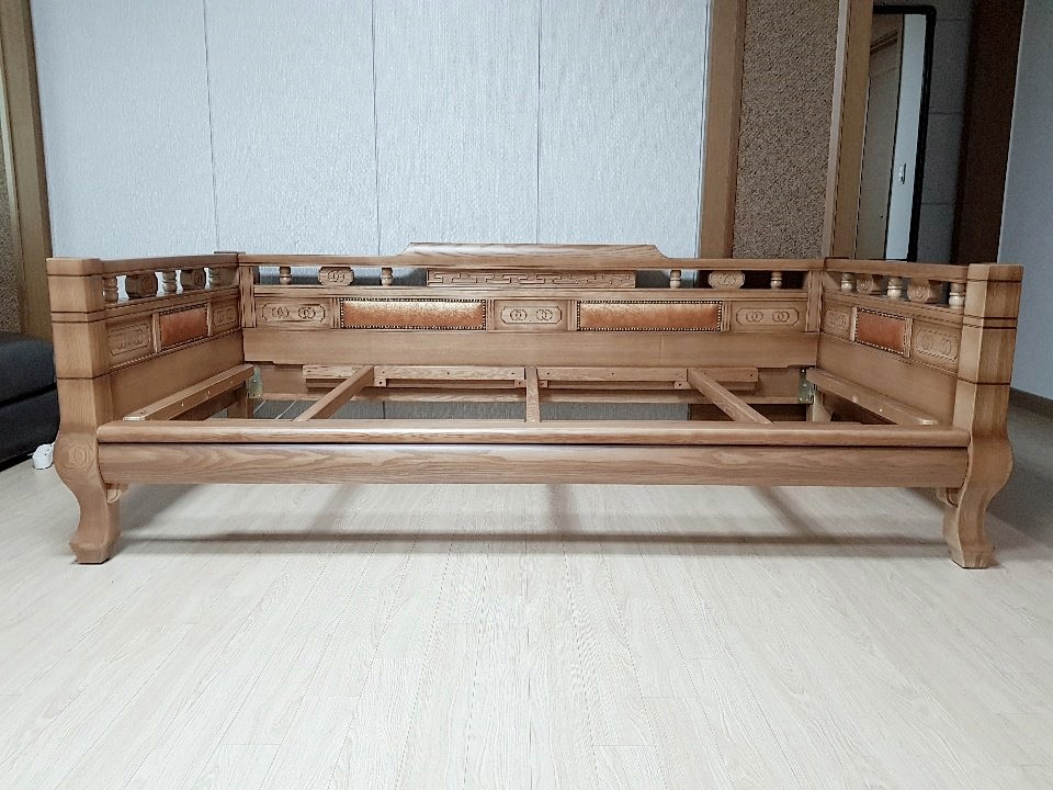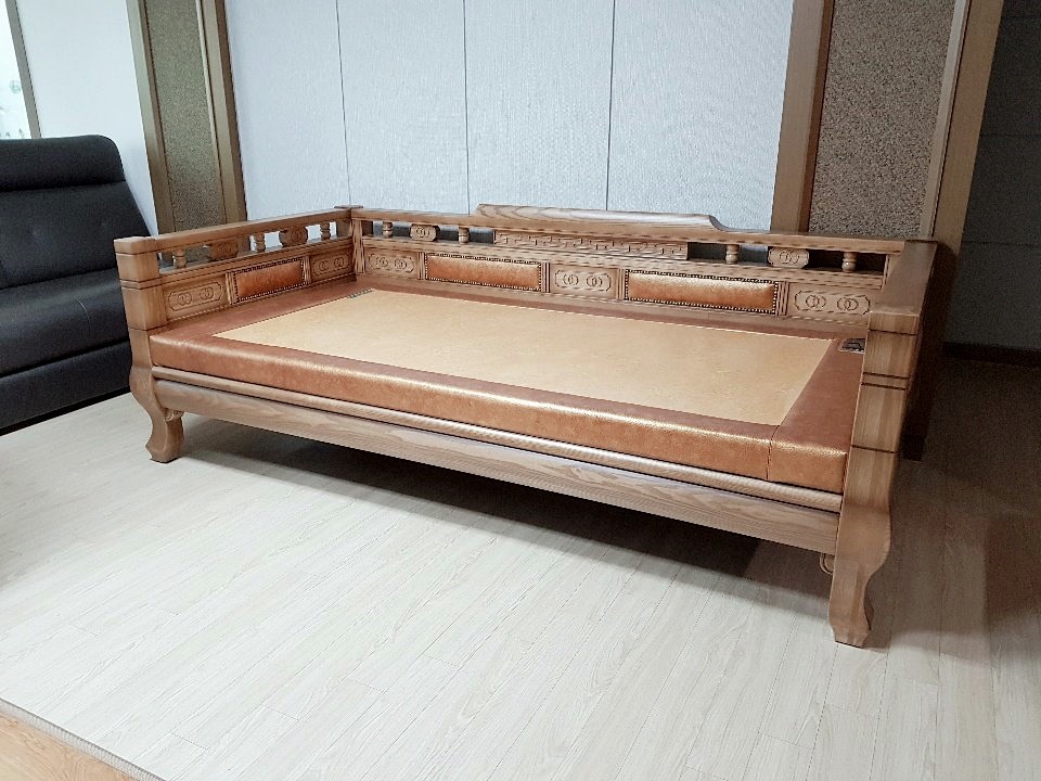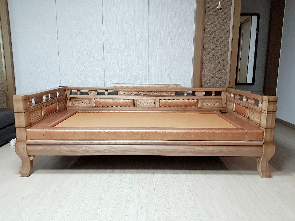 물푸레원목을 거의 100% 사용한 평상형제품으로 밝은 엔틱프레임에 천연소가죽 면피를 사용했습니다.