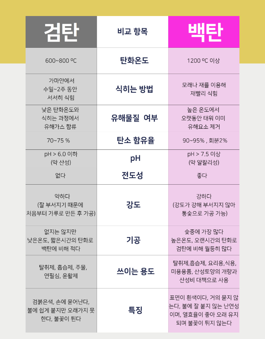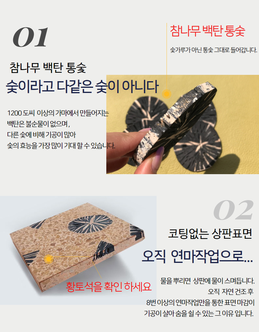 백탄통숯을 사용하는 가장 큰 이유는 다른 숯들에 비해 기공이 많아 효능이 크고 단단하며 묻어남이 없기 때문입니다.