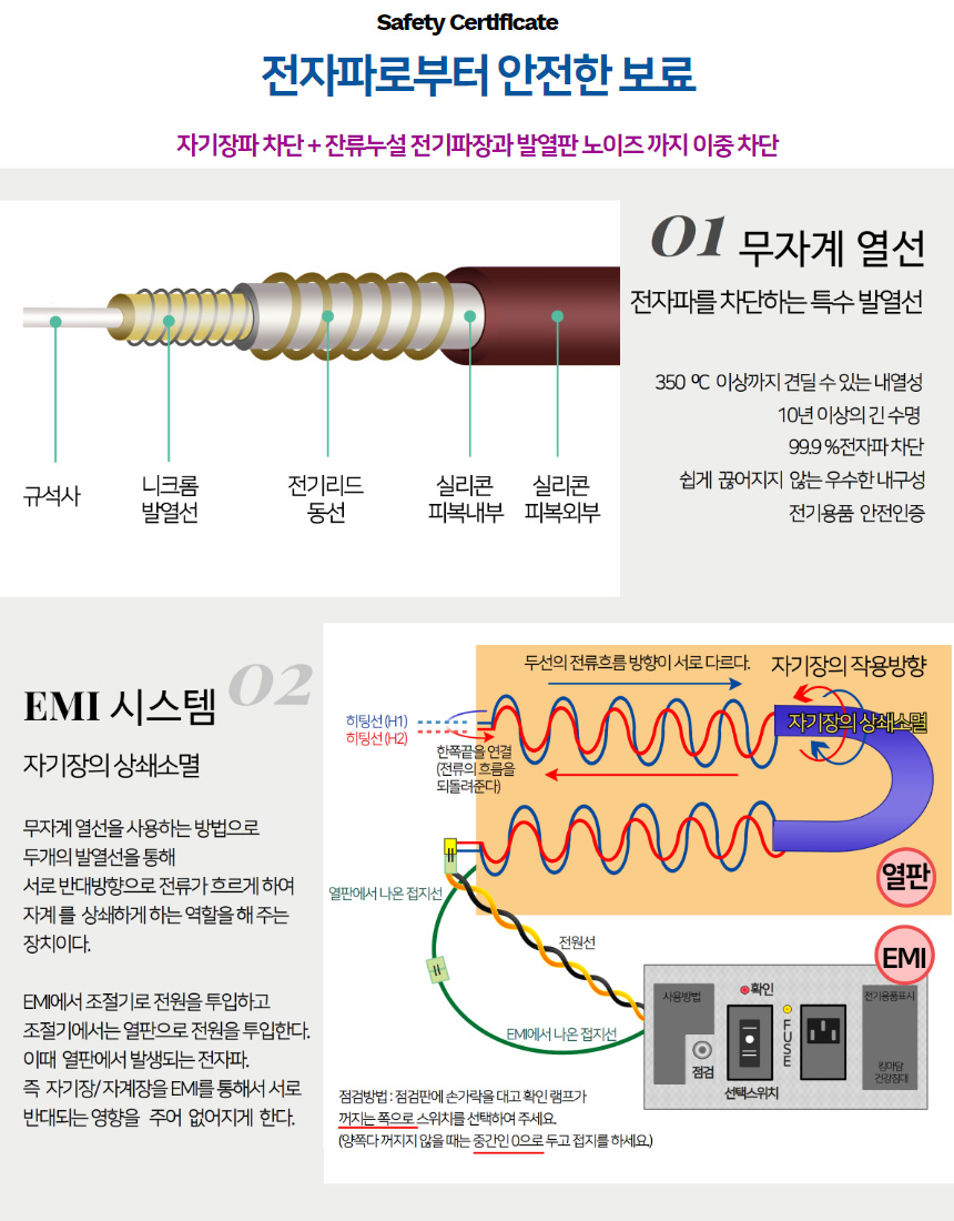 안에 깔리는 열선은 무자계열선을 사용하여 전자파를 완벽 차단했습니다.
